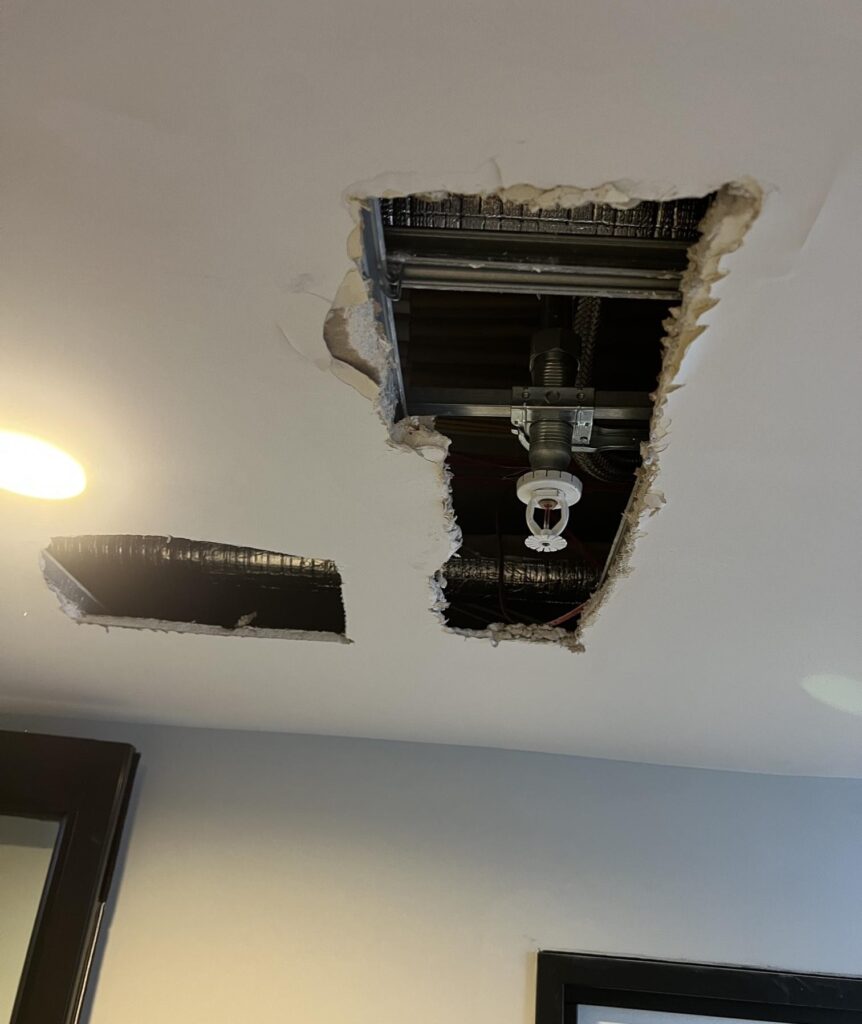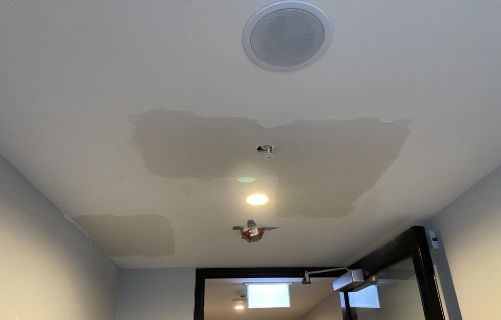 Water ingress had caused damage to plasterboard ceiling systems, requiring sections to be opened for access and inspection of internal services. The works needed to be carried out safely within a live building while maintaining access and ensuring finishes were reinstated to a consistent standard.